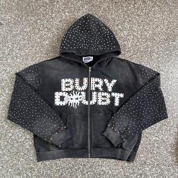 Benutzer definierte hochwertige Sun Faded Heavyweight 400gsm Vintage 100% Baumwolle Reiß verschluss Boxy Fit Reiß verschluss Strass Hoodie für Männer